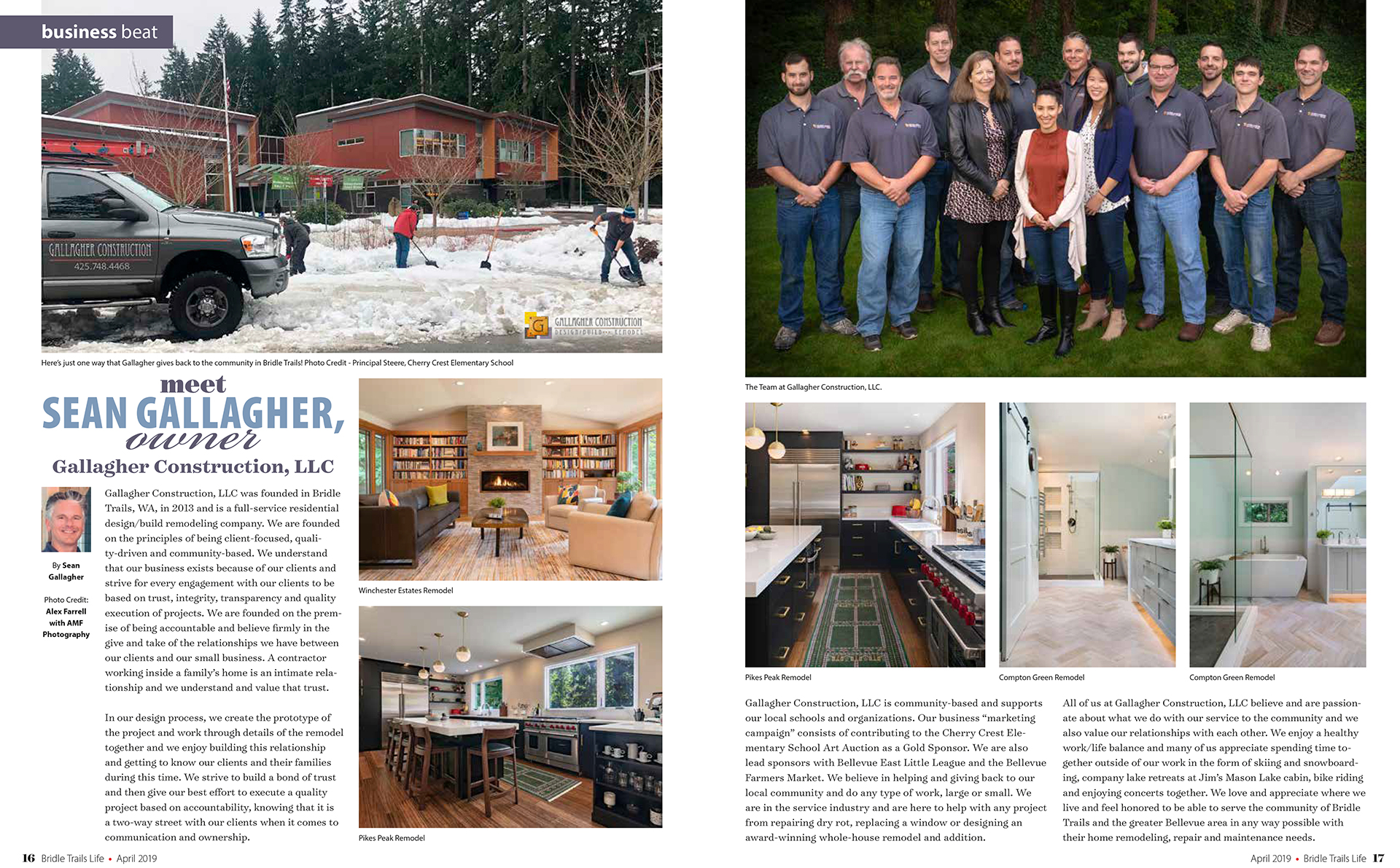 The Article "Meet Sean Gallagher, owner Gallegher Construction,LLC" by Bridle Trails LIFE, issue April 2019. [click here to read the full article]